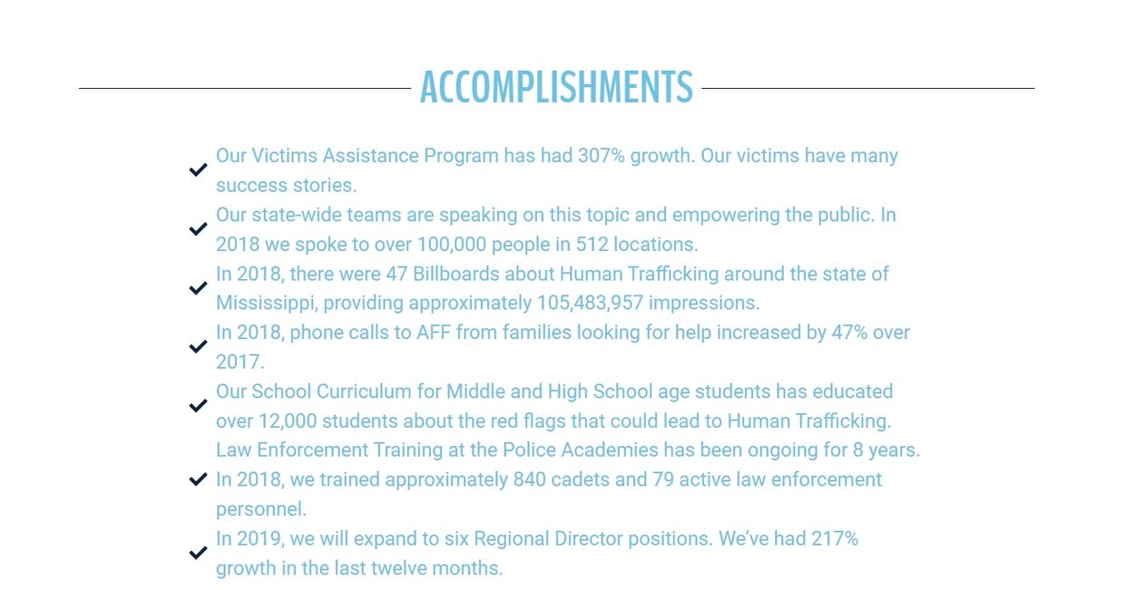 Throughout Mississippi, AFF is bringing awareness about human trafficking. We are working with others throughout the law enforcement, business, government, education, medical, media/arts, non-profit and faith communities (among others), to help victims and end this modern form of slavery. AFF wants to inspire the public to “look beneath the surface” and help find a solution to end human trafficking, locally and abroad. AFF is initially focused on meeting a victim’s need for shelter and protection.